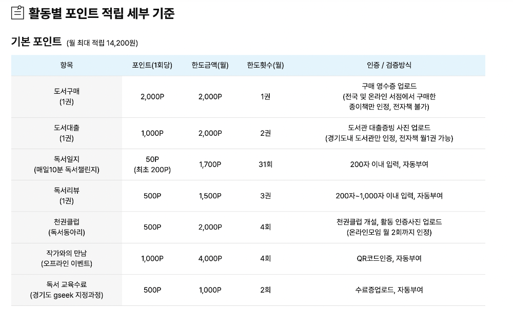 이번 독서포인트제의 가장 큰 특징은, 실질적인 혜택이 주어진다는 점입니다. 도서 구매 시 월 1권 한도 내에서 2,000포인트, 도서관 책 대여 시 권당 1,000포인트(월 2권 한도)가 적립되며, 독서일지 작성, 서평 등록 등 다양한 독후 활동에 대해서도 별도의 포인트가 제공됩니다.
