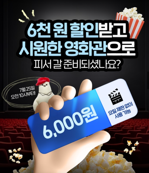 발급은 2025년 7월 25일 금요일 오전 10시부터 선착순으로 진행되며, 이용자는 CGV 롯데시네마 메가박스 씨네Q 등 주요 영화관 누리집이나 앱을 통해 할인권을 받을 수 있습니다.