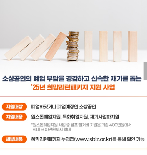 이에 따라 정부는 점포 철거에 필요한 비용을 보조하는 사업을 운영하고 있으며 2025년에는 이를 더욱 확대했습니다. 기존에는 최대 400만 원까지 지원했으나 올해부터는 최대 600만 원까지 지원금이 상향되었습니다. 지원 대상도 기존 3만 개 사에서 4만 개 사로 확대되어 더 많은 폐업 소상공인이 혜택을 받을 수 있게 되었습니다.