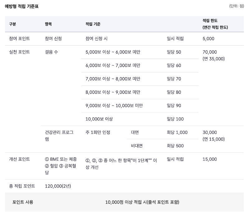 건강수치가 개선되었을 경우에도 인센티브가 제공됩니다. BMI, 혈압, 공복혈당 중 한 가지 이상이 개선될 경우 1만 5천 점의 포인트가 일시 지급되며, 이를 통해 건강한 결과에 대한 보상을 받을 수 있습니다. 예방형의 경우 2년간 최대 12만 점까지 포인트를 적립할 수 있도록 설계되어 있습니다.
