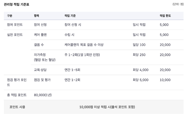 관리형 참여자는 케어플랜을 수립하는 것만으로도 포인트가 지급되며, 정해진 목표 걸음 수 이상 실천, 자가 혈압 및 혈당 측정, 교육·상담 참여 등 다양한 항목을 통해 연간 최대 8만 점까지 적립이 가능합니다.