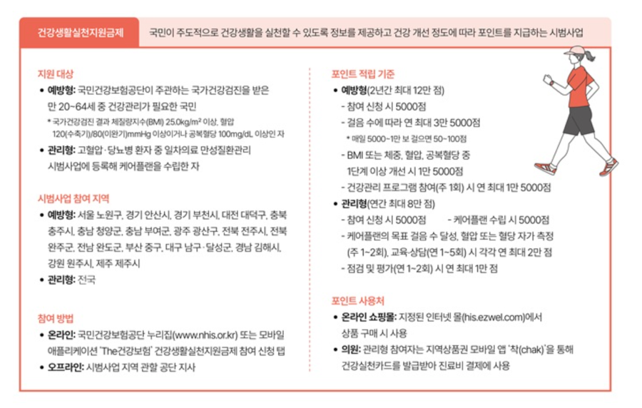 건강생활실천지원금제는 국민건강공단이 건강 위험 요인을 가진 국민들이 보다 쉽게 건강한 생활을 실천할 수 있도록 지원하는 제도입니다. 일정 조건에 해당하는 국민이 걷기, 식습관 개선, 혈압 및 혈당 측정 등 일상 속에서 건강에 도움이 되는 활동을 하면, 그 실천에 따라 포인트가 적립되고 이 포인트는 실제 현금처럼 사용할 수 있습니다.