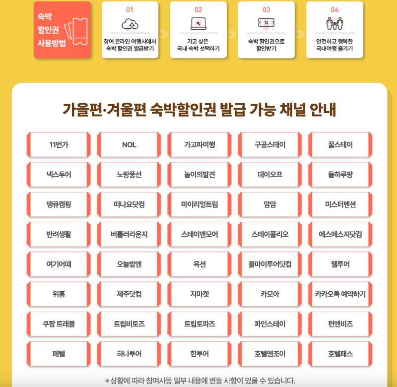 할인권은 호텔, 리조트, 콘도, 펜션 등 국내 등록 숙박시설에서만 사용 가능하며 대실 상품이나 미등록 숙박시설은 적용 대상에서 제외됩니다.