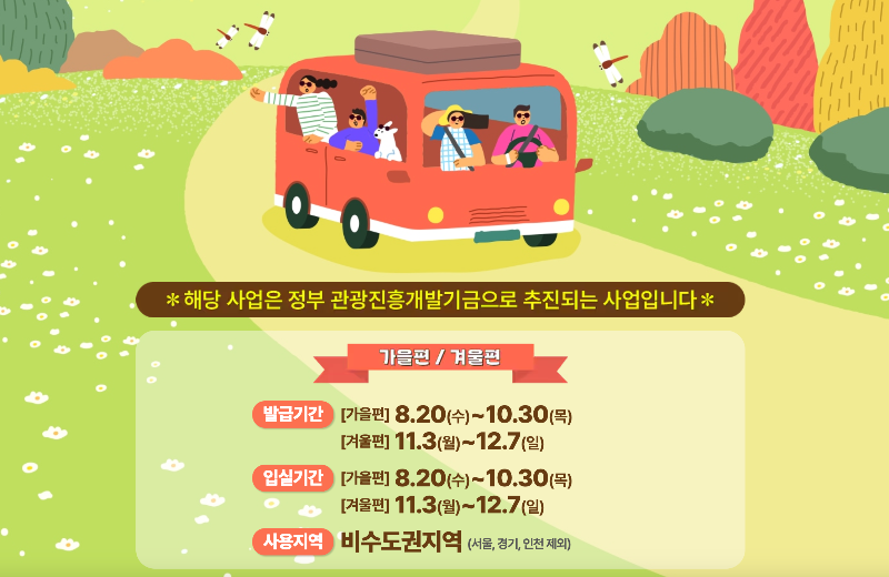 가을편과 특별재난지역편은 8월 20일부터 10월 30일까지 진행되며 겨울편은 11월 3일부터 12월 7일까지 운영됩니다. 각 기간별로 1인당 1매씩 최대 2회까지 할인 혜택을 받을 수 있습니다. 단 가을편과 특별재난지역편의 할인권은 중복 발급이 불가하므로 유의해야 합니다.